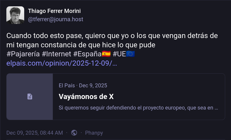 Thiago Ferrer Morini lleva meses pidiéndolo desde Mastodon y su columna en El País. Vayámonos de X.